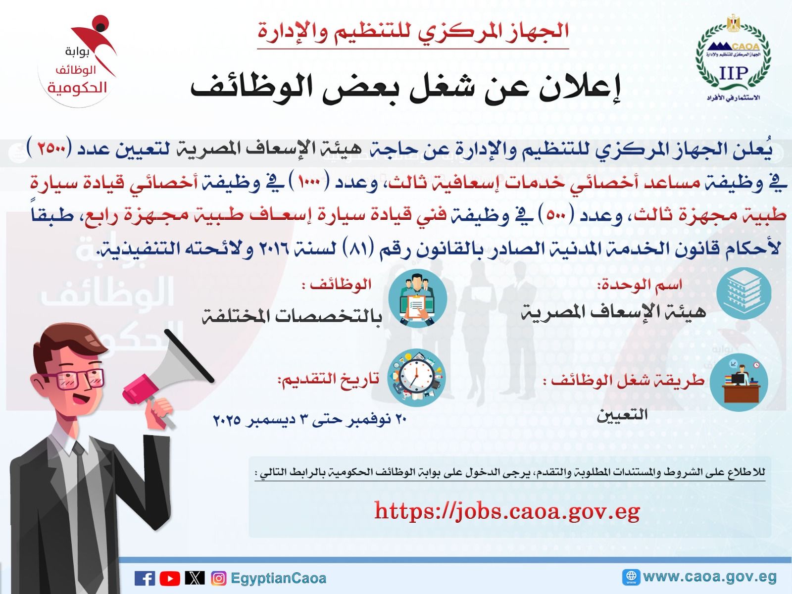 الثلاثاء، 04 نوفمبر 2025 02:20 ميُعلن الجهاز المركزي للتنظيم والإدارة، برئاسة المهندس حاتم نبيل، عن حاجة هيئة الإسعاف المصرية لتعيين 2500 في وظيفة مساعد أخصائي خدمات إسعافية ثالث، و1000 في وظيفة أخصائي قيادة سيارة طبية مجهزة ثالث، و500 في وظيفة فني قيادة سيارة إسعاف طبية مجهزة رابع، طبقاً لأحكام قانون الخدمة المدنية الصادر بالقانون رقم (81) لسنة 2016 ولائحته التنفيذية.