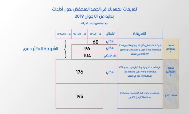 وقد تم اعتماد تخفيض بنسبة 10% في تعريفة الكهرباء بالنسبة لمليون عائلة ذات الاستهلاك الأقل من مجمل 3 مليون و750 ألف عائلة، بالإضافة إلى 50 مليون دينار لسداد فواتير الكهرباء المتأخرة عن العائلات ذات الدخل المحدود، والحفاظ على سعر تعريفة الكهرباء لصالح مليونين و 500 ألف عائلة ذات الدخل المتوسط.