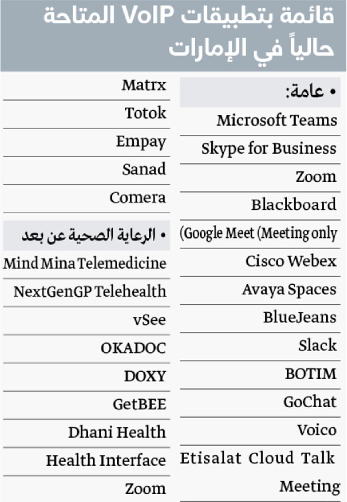 بدورها، قالت هيئة تنظيم الاتصالات والحكومة الرقمية، إن «المكالمات الصوتية والمرئية تعدّ من خدمات الاتصال الصوتي عبر بروتوكول الإنترنت (VOIP) التي تُعدّ نشاطاً منظماً في الدولة، ويتم تقديم هذه الخدمات من قبل مقدمي الخدمة المرخص لهم، أو بالتعاون معهم».