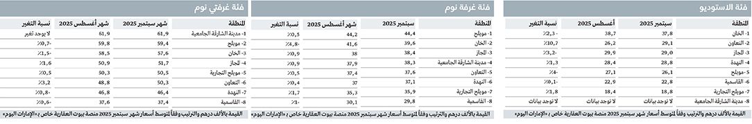 مناطق «الخان» و«التعاون»، و«المجاز»، و«النهدة»، من بين المناطق الأعلى من حيث متوسط كلفة الإيجارات سنوياً خلال سبتمبر 2025، فقد سجلت منطقة التعاون أعلى معدل في نمو متوسط قيمة الإيجار السنوي للاستوديو بنسبة 10.7%، على الرغم من تصدر منطقة الخان، قائمة المناطق الأعلى من حيث متوسط كلفة الإيجار سنوياً خلال سبتمبر 2025، وسجلت منطقة «مويلح» أعلى متوسط سعر للإيجار في الشارقة خلال شهر سبتمبر الماضي.