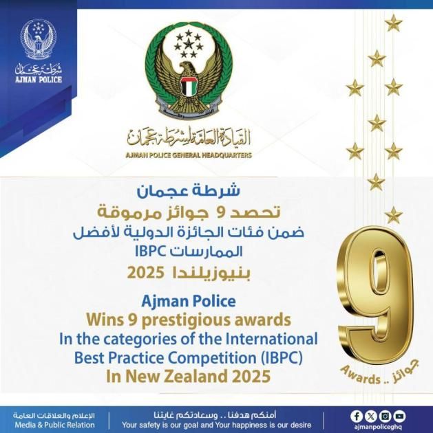 حققت القيادة العامة لشرطة عجمان إنجازاً نوعياً جديداً يضاف إلى سجلها الحافل بالنجاحات، حيث فازت بعدد 9 جوائز دولية في الدورة الحادية عشرة للجائزة الدولية لأفضل الممارسات (IBPC) التي أُقيمت في نيوزيلندا لعام 2025، وسط مشاركة واسعة من مختلف المؤسسات العالمية.