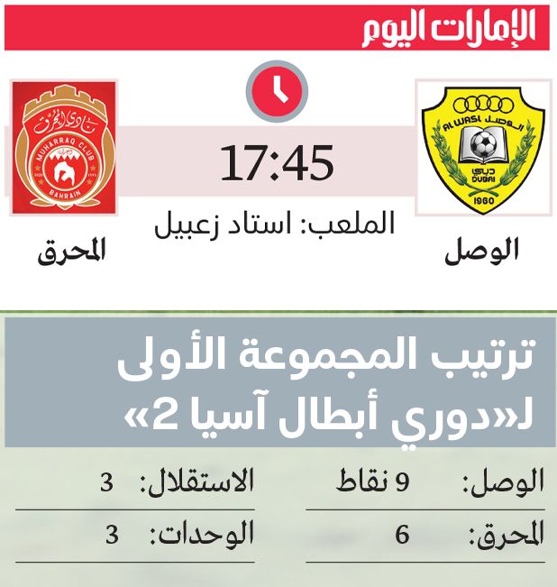 يستهدف الوصل تكرار انتصاره على المحرق البحريني عندما يلتقيان على استاد زعبيل اليوم، في الساعة 17:45، في الجولة الرابعة من مباريات المجموعة الأولى من بطولة «دوري أبطال آسيا 2»، حيث يسعى «الإمبراطور» إلى حسم تأهله مبكراً إلى الدور المقبل، قبل خوض الجولتين الخامسة والسادسة من دور المجموعات أمام الاستقلال الإيراني والوحدات الأردني.
