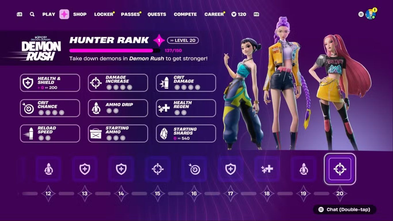 بعد تحديث 2 أكتوبر، لاحظ اللاعبون ظهور تبويب جديد في قائمة Fortnite مخصص لتوضيح مستوى Hunter Rank. هذا التبويب يعرض سلسلة من التعزيزات التي يمكن الحصول عليها، لكنه مقصور حصريًا على طور Demon Rush المرتبط بفعالية Kpop Demon Hunters ضمن حدث Fortnitemares.