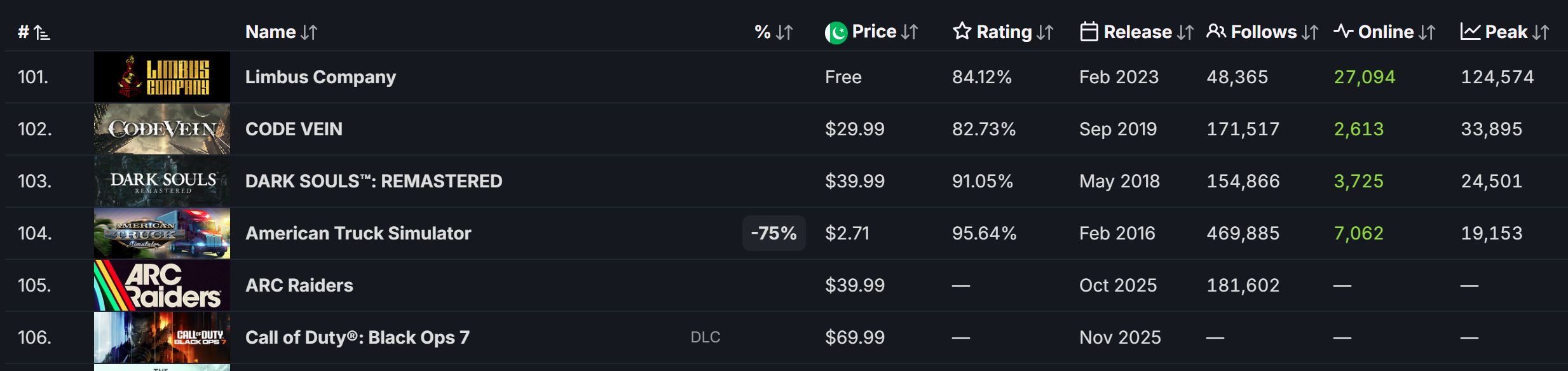 تحتل Black Ops 7 حاليًا المرتبة 106 ضمن أكثر الألعاب مبيعًا على المنصة، أي أنها خارج المئة الأولى تمامًا، وتتفوق عليها ألعاب مثل Hollow Knight: Silksong و Clair Obscur: Expedition 33 و Digimon Story Time Stranger و Arc Raiders.