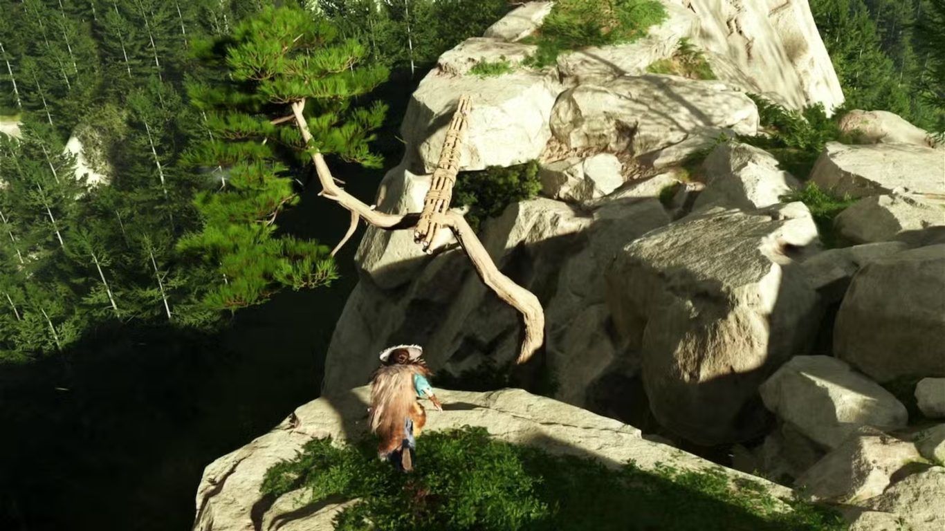 بعد إتمام التأرجح الأول بنجاح، اتجه نحو اليمين على المسار الجبلي الضيق المحاط بالأشجار الملتفة ستلاحظ أمامك غصن شجرة طويل يمتد من الجرف باتجاه الوادي هذا هو هدفك التالي خذ بعض الخطوات للوراء لتكتسب سرعة كافية ثم اقفز نحو الغصن واضغط R2 لتثبيت الخطاف إذا احتجت إلى دعم إضافي عند الإمساك به بعد أن تتشبث بالغصن استخدم الزخم لتقفز مجددًا نحو المنصة الحجرية المقابلة التي ترتفع قليلاً عن مستوى الغصن وستجدها مضاءة بفانوس حجري يوجهك نحو الطريق الصحيح.