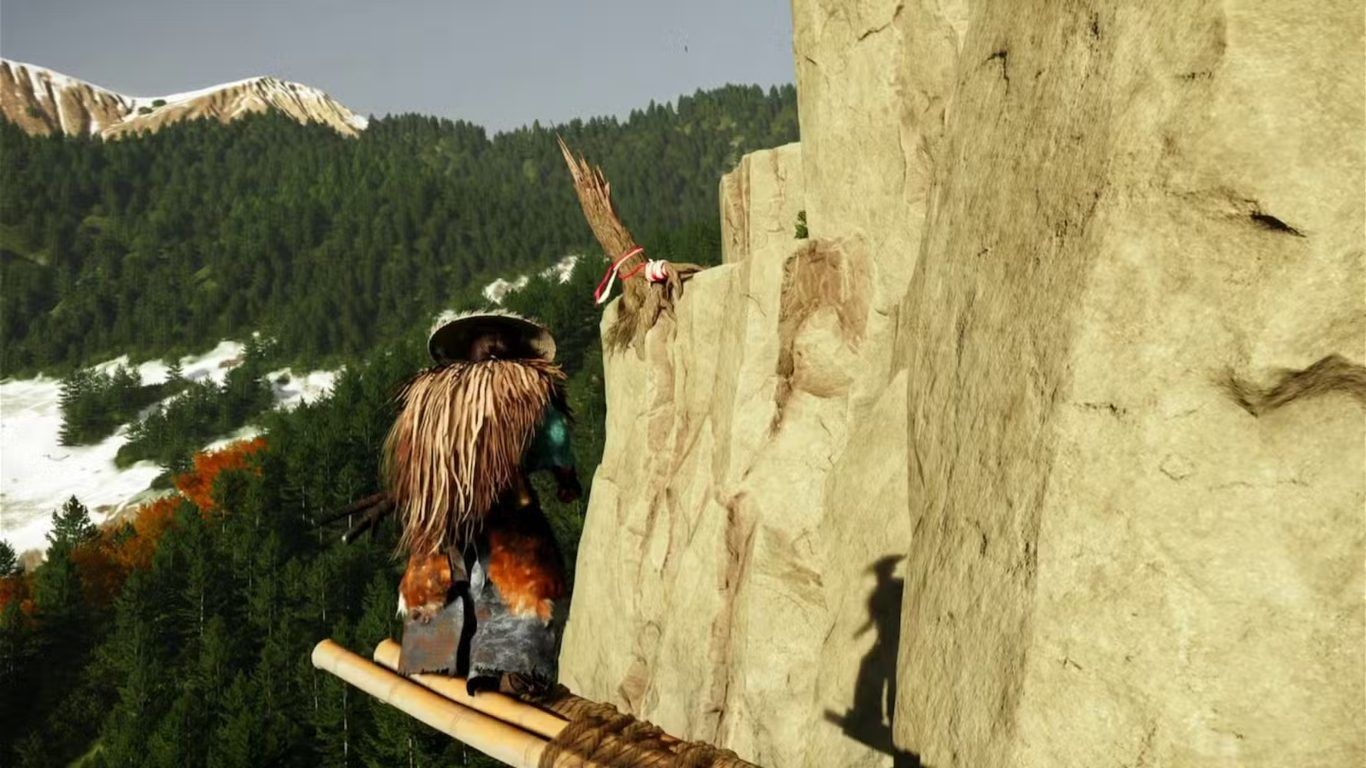 بعد أن تنتهي من عبور جسر الخيزران، تابع السير على الممر الضيق الذي يمتد على حافة الجبل هذا الممر يشكل أحد أكثر المقاطع توترًا في Faithful Leap Shrine إذ تحيط بك من الجانبين منحدرات شديدة العمق يغمرها الضباب في الأسفل بينما تتسلل أشعة الشمس من بين الأشجار الكثيفة في الأعلى لتضيء طريقك بخطوط ذهبية خافتة تقدم بحذر وابق قريبًا من الجدار الحجري حتى لا تفقد توازنك عند المنعطفات الحادة.
