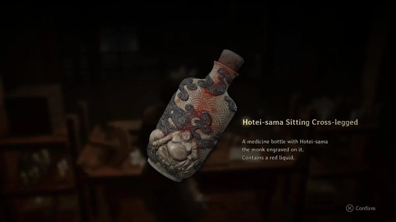 داخل المبنى الوحيد في هذه المنطقة السرية، ستجد زجاجة دواء Hotei-sama الجالس متربعًا على الطاولة. هذا العنصر ضروري لتفعيل نهاية Fox’s Wedding، لكنه ليس الخطوة الأخيرة.