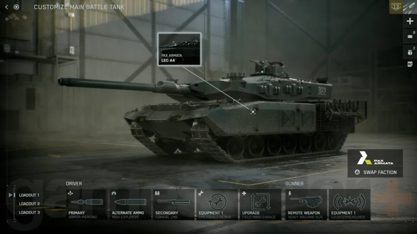 • السائق: مزود بمدفع رئيسي يحتوي على نوعين من القذائف (أساسية وبديلة) يمكن التبديل بينهما حسب الموقف، بالإضافة إلى مدفع رشاش ثانوي مخصص للتعامل مع المشاة القريبين. يمتلك السائق أيضًا خانة واحدة لتركيب قطعة معدات إضافية مثل أنظمة الدخان أو أدوات الإصلاح، إلى جانب إمكانية إضافة ترقية خاصة لتعزيز قدرات الدبابة الدفاعية أو الهجومية.