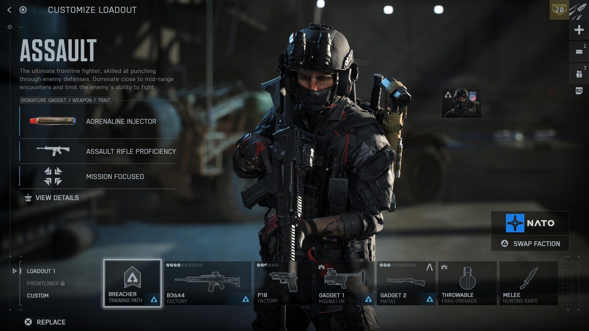 ميزة فئة Assault تكمن في إمكانية إضافة سلاح رئيسي ثانٍ إلى تجهيزاتك، وهنا يأتي دور بندقية M87A1 الشوتغن. إنها أول بندقية شوتغن متاحة في اللعبة، ووضعها في أحد خانات الأدوات (حسب تخطيط أزرارك) يُعد خياراً أفضل بكثير من التبديل إلى مسدس P18 عند نفاد الذخيرة. صحيح أنها فعالة فقط في المدى القريب والمتوسط، لكنها تُحدث ضرراً أكبر لكل طلقة مقارنة بإعادة تعبئة بندقيتك الهجومية.