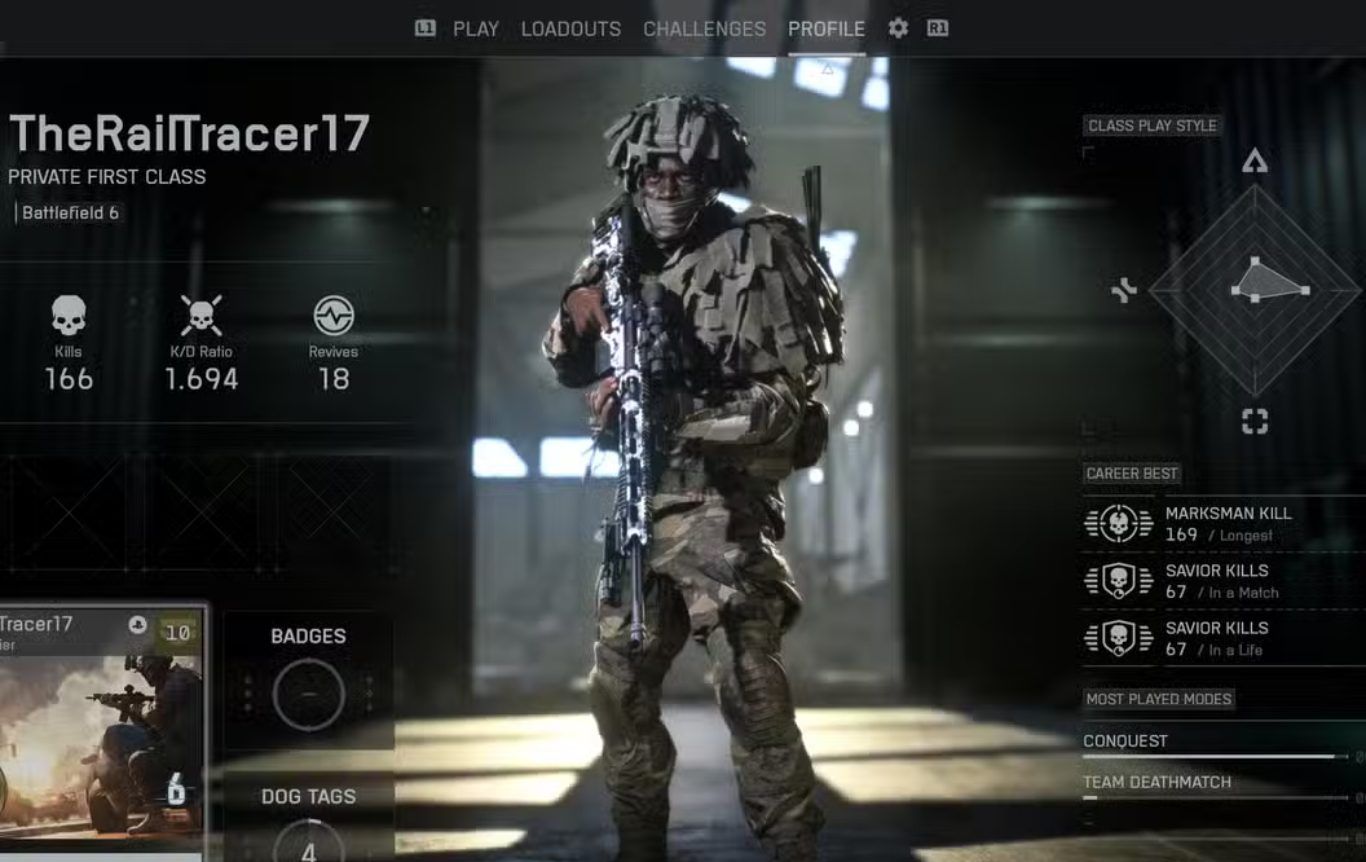 من أول الأمور التي يقوم بها اللاعبون بعد تشغيل Battlefield 6 أو بعد خوض عدد من المباريات عبر الإنترنت هي التوجه إلى تبويب الملف الشخصي (Profile) هذا القسم يعرض تفاصيل الأداء الشخصي مثل إجمالي النقاط ونسبة القتل إلى الموت (K/D Ratio) كما يتيح تعديل بطاقة اللاعب (Player Card) لتخصيص مظهر الحساب داخل اللعبة.
