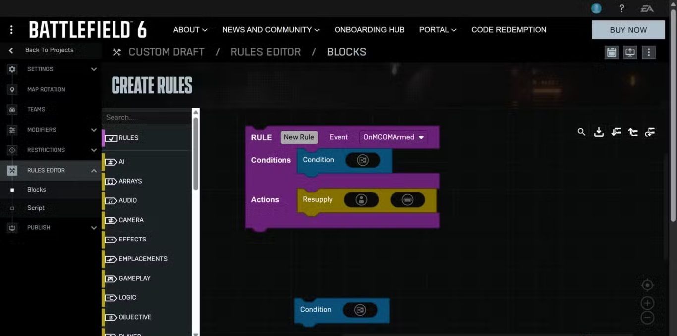 يُعد Rules Editor أو محرر القواعد من أكثر الأدوات تعقيدًا وعمقًا في Battlefield 6 Portal، وهو متاح فقط عند اختيارك لخيار Custom Mode. هذا القسم هو المكان الذي يمكنك فيه بناء المنطق الداخلي لقواعد نمط اللعب الخاص بك، لتتحكم بكل جزئية من مجريات المباراة، بدءًا من سلوك اللاعبين وحتى تفاعل الأهداف والمكافآت.