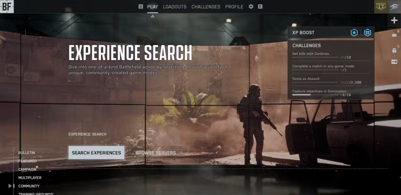 ابدأ بتشغيل Battlefield 6، ثم توجه إلى علامة التبويب Community (المجتمع) من القائمة الرئيسية. بعد الدخول، اختر خيار “Search Experiences”، لتظهر أمامك قائمة ضخمة تحتوي على عدد كبير من التجارب التي أنشأها مجتمع اللاعبين حول العالم.