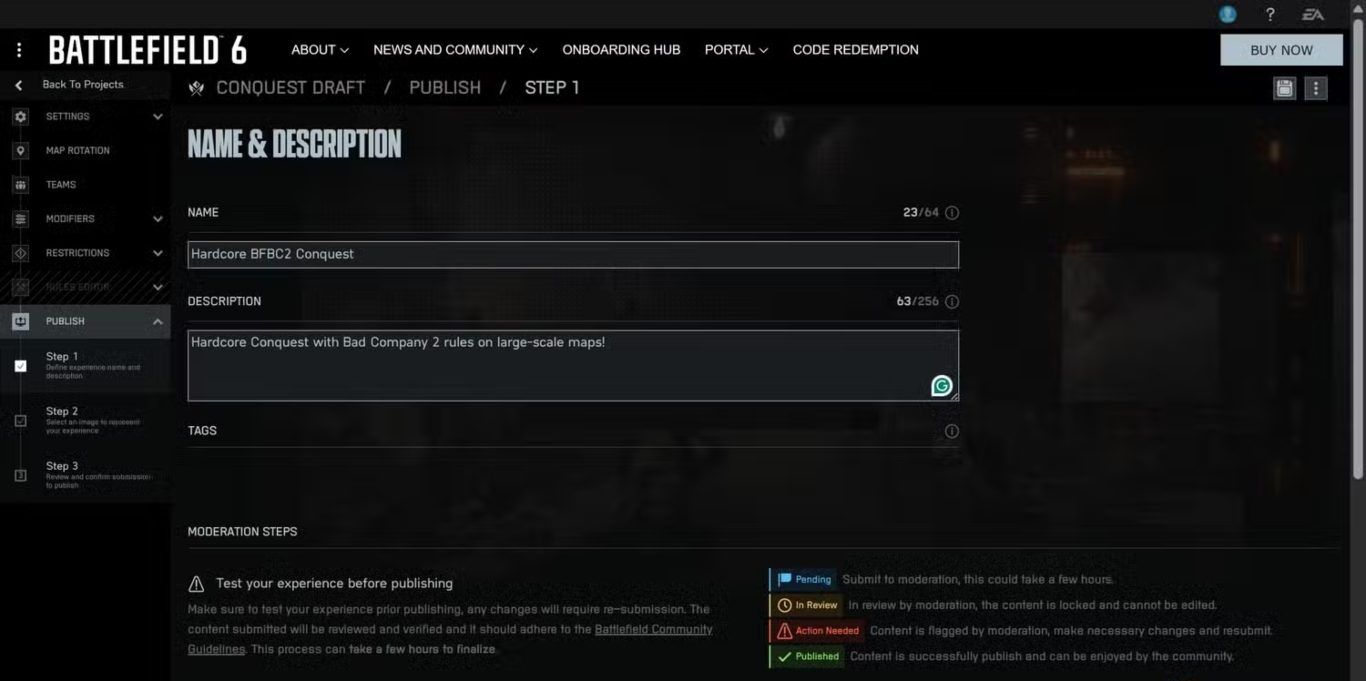 في المرحلة الأخيرة من إعداد نمطك المخصص داخل Battlefield 6 Portal، ستصل إلى تبويب Publish، وهو المكان الذي تقوم فيه بنشر تجربتك رسميًا وجعلها متاحة للاعبين الآخرين. هذه الخطوة تمثل نهاية عملية الإنشاء وبداية عرض خادمك للعالم، بحيث يمكن لأي لاعب العثور عليه وتجربته مباشرة من داخل اللعبة.