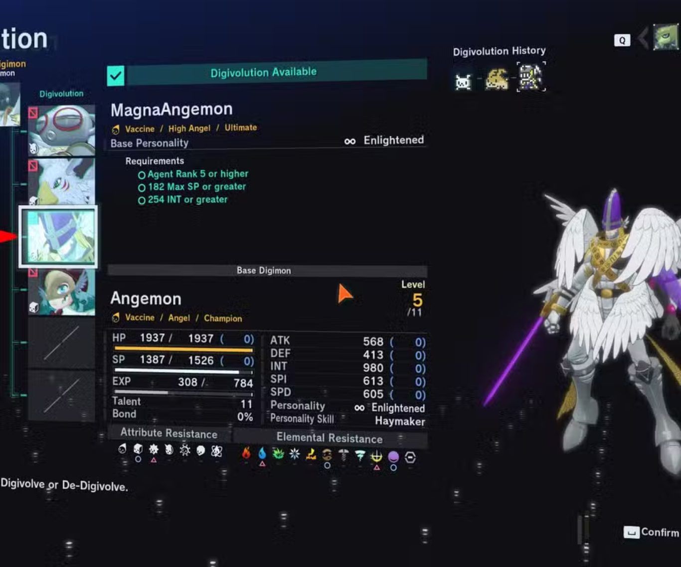 ابدأ بتطوير Angemon إلى MagnaAngemon ثم تابع تطويره مرة أخرى إلى Goldramon بعد ذلك قم بعكس العملية De-digivolve لتحويل Goldramon إلى Shakkoumon ثم قم بعكس التطور مرة أخرى لإعادة Shakkoumon إلى Angemon مع التأكد من أن Angemon هو الـ Digimon الأساسي Primary في الفريق.