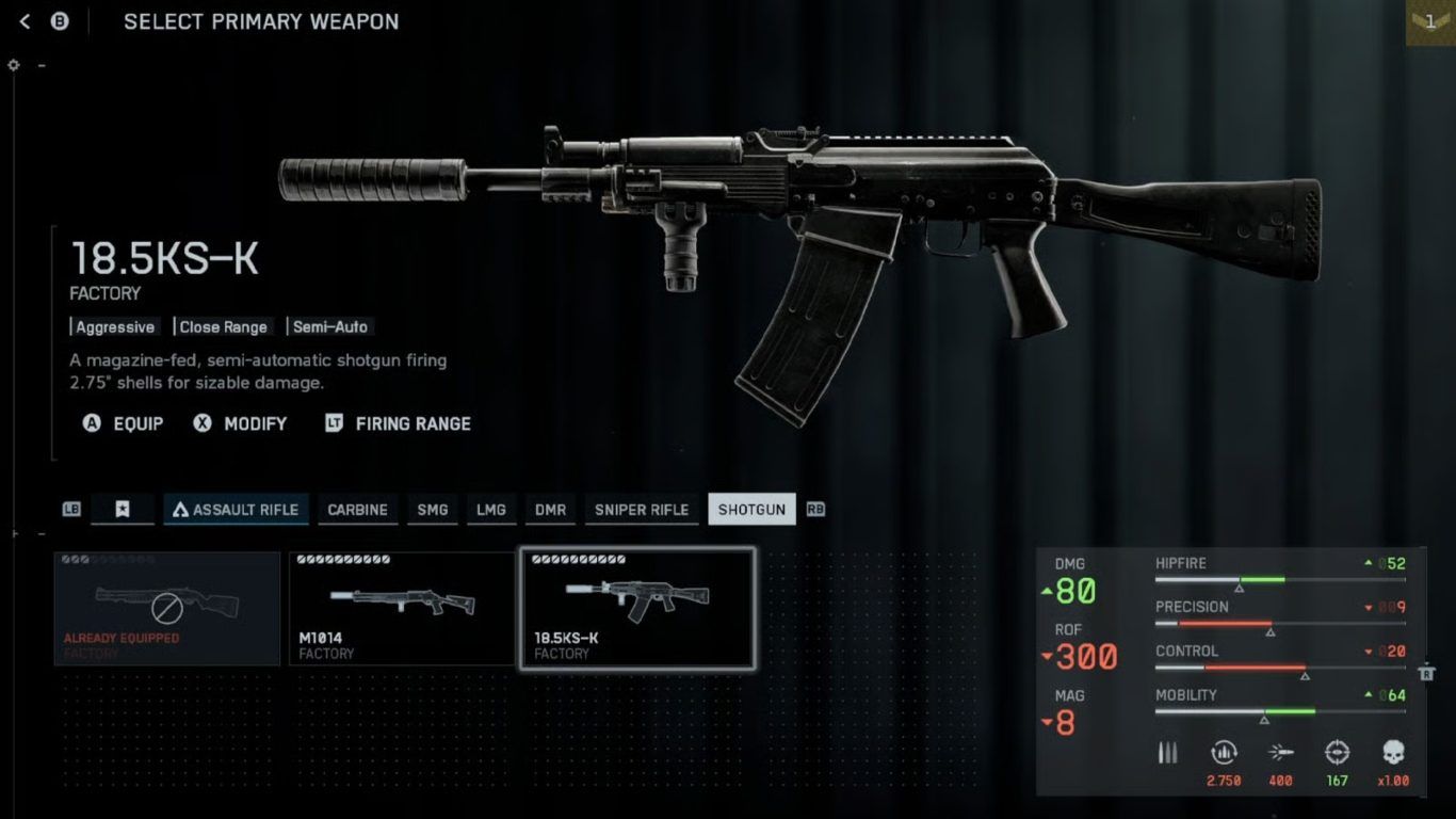 ولا تتوقف مزاياها عند ذلك، إذ تمتلك 18.5KS-K أيضًا أفضل دقة في الإطلاق من الوضع الحر (Hipfire Accuracy) بين جميع بنادق الشوتجن في اللعبة، ما يعني أنك لست مضطرًا للتصويب بدقة عبر المنظار في كل مرة. يكفي أن تقترب من العدو قليلًا، وستتمكن من القضاء عليه بسهولة بفضل انتشار الرصاص الواسع وقوة الضرر القريب.