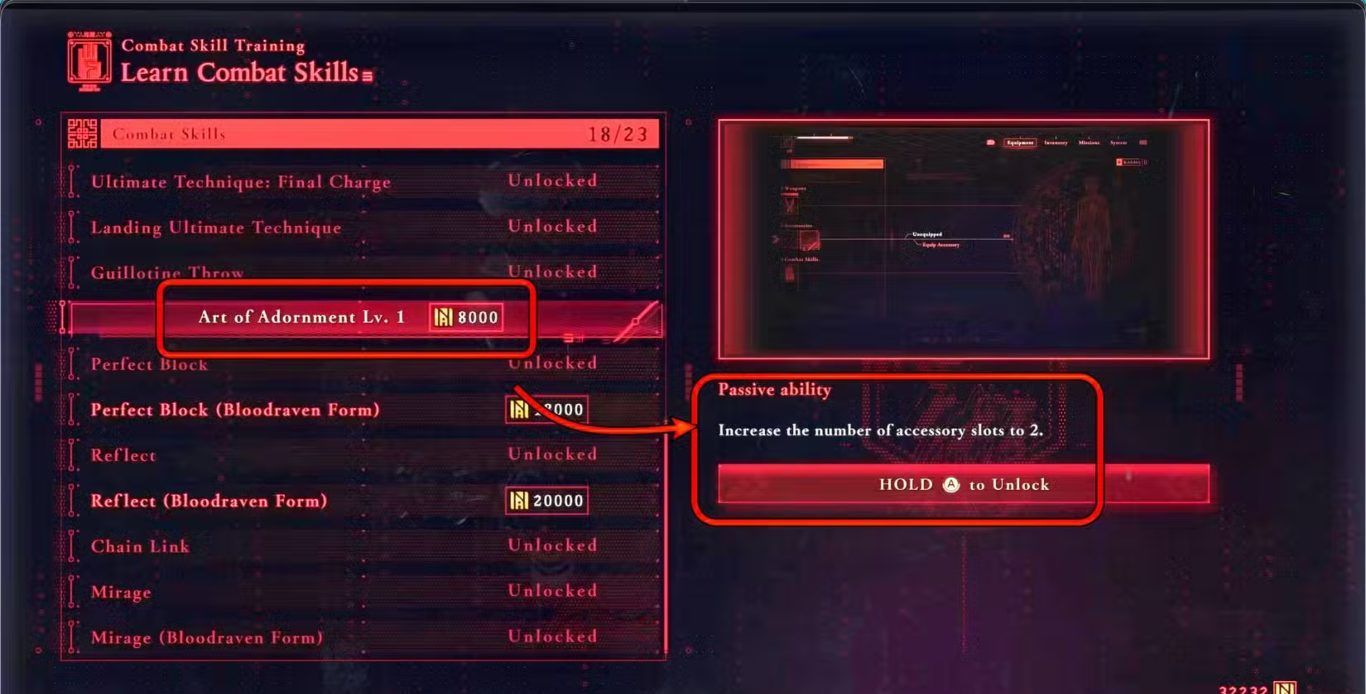 عند وصولك إلى الفصل الرابع من لعبة Ninja Gaiden 4 يبدأ Tyran في تقديم خدمة جديدة تضيف بعدًا مختلفًا تمامًا لتجربة التطوير في اللعبة ففي زيارتك الأولى له خلال مهمة طريق الحاج الذي تعصف به الرياح ستلاحظ أن قائمة مهارات القتال لديه قد توسعت وأضيفت إليها مهارة جديدة تُعرف باسم Act of Adornment Lv. 1 وهي أول خطوة في نظام ترقية خانات الإكسسوارات الذي كان مغلقًا في الفصول السابقة.