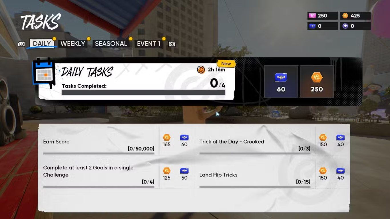 بمجرد إنهاء هذه المهمة ستتمكن من فتح تبويب المهام Tasks في القائمة الرئيسية والذي يحتوي على مجموعة من التحديات اليومية بما في ذلك تحدي Trick of the Day لحركة Crooked إضافة إلى تحديات أخرى تعتمد على أسلوبك في اللعب ومهارتك في الجمع بين الحركات المختلفة بشكل احترافي.