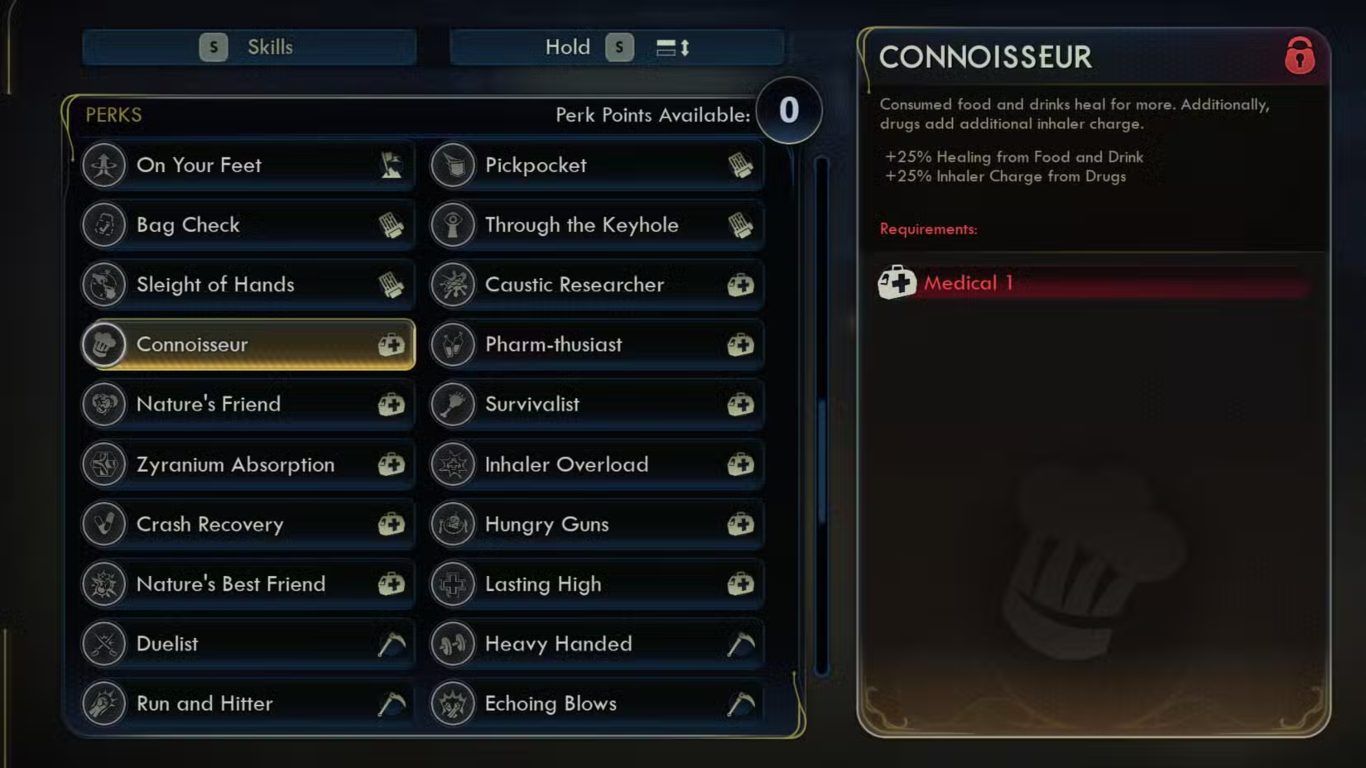 تُعد مهارة Connoisseur من أهم المهارات التي يمكن للاعب الحصول عليها في لعبة The Outer Worlds 2 خصوصًا لأولئك الذين يعتمدون بشكل أساسي على جهاز Inhaler للعلاج أثناء المعارك والاستكشاف. تمنح هذه المهارة تأثيرين رئيسيين يجعلانها من أكثر الترقيات فائدة في المراحل الأولى من اللعبة حيث تزيد من فعالية استعادة الصحة من الأطعمة والمشروبات بنسبة 25٪ كما ترفع مقدار الشحنة المكتسبة من العناصر الدوائية Drug Items بنسبة إضافية تبلغ 25٪ مما يجعل كل عملية جمع أو علاج أكثر كفاءة وفاعلية.