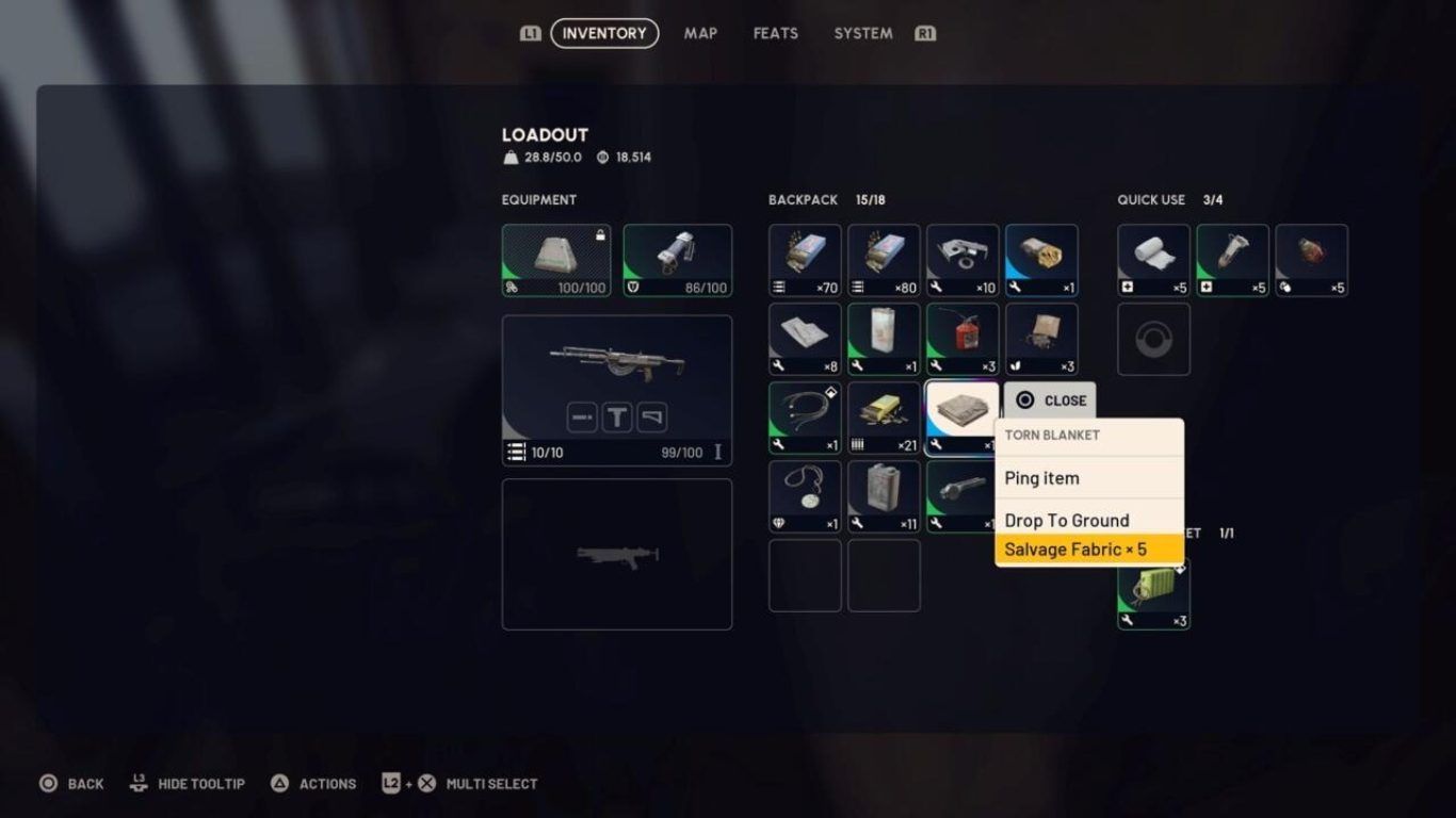 من الطبيعي أن تمتلئ مساحة الجرد بسرعة كبيرة أثناء النهب، خاصة في المراحل الأولى من اللعبة قبل أن تتمكن من الحصول على حقيبة أكبر. لكن هذا لا يعني أنك يجب أن تتجنب جمع العناصر أو تتخلص منها بشكل عشوائي. بدلًا من ذلك، حاول الاختباء في مكان آمن وفتح الجرد لمراجعة محتوياته. ابحث عن العناصر التي يمكن تفكيكها (Salvage) إلى مواد أساسية مثل القماش (Fabric) أو الأجزاء المعدنية (Metal Parts). هذه المواد قابلة للتكديس بسهولة (Highly Stackable) ويمكن تفكيكها في منتصف الجولة لتوفير مساحة إضافية في الجرد دون خسارة قيمتها.