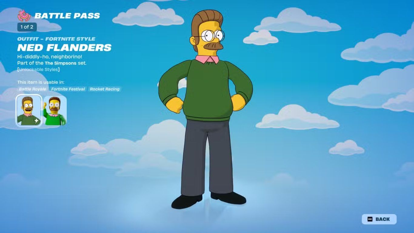 تُعد شخصية Ned Flanders من أبرز الإضافات في تعاون Fortnite مع عالم The Simpsons وهي واحدة من أكثر الشخصيات التي ينتظرها اللاعبون نظرًا لشعبيتها في المسلسل وشخصيتها المميزة التي تجمع بين الطيبة المفرطة والطابع الكوميدي الغريب حيث يظهر Ned في اللعبة بنفس مظهره الكلاسيكي الذي يعرفه الجميع من المسلسل بقميصه الأخضر وسرواله البني ونظارته الدائرية وابتسامته الودودة التي لا تفارقه حتى وسط المعارك.