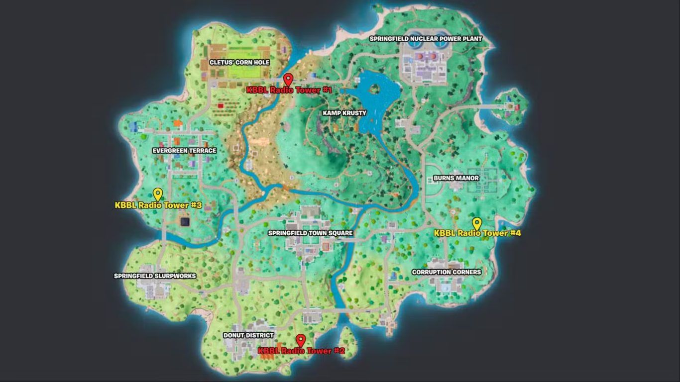 تضم خريطة Springfield داخل لعبة Fortnite أربع نقاط محتملة لظهور أبراج الراديو KBBL، ولكن المميز في هذا النظام هو أن فقط برجين من الأربعة يظهران في كل مباراة. هذه الأبراج تُعد عنصرًا أساسيًا للحصول على معلومات عن الدائرة القادمة، مما يمنح اللاعبين أفضلية استراتيجية في التخطيط والتحرك مبكرًا نحو المناطق الآمنة.