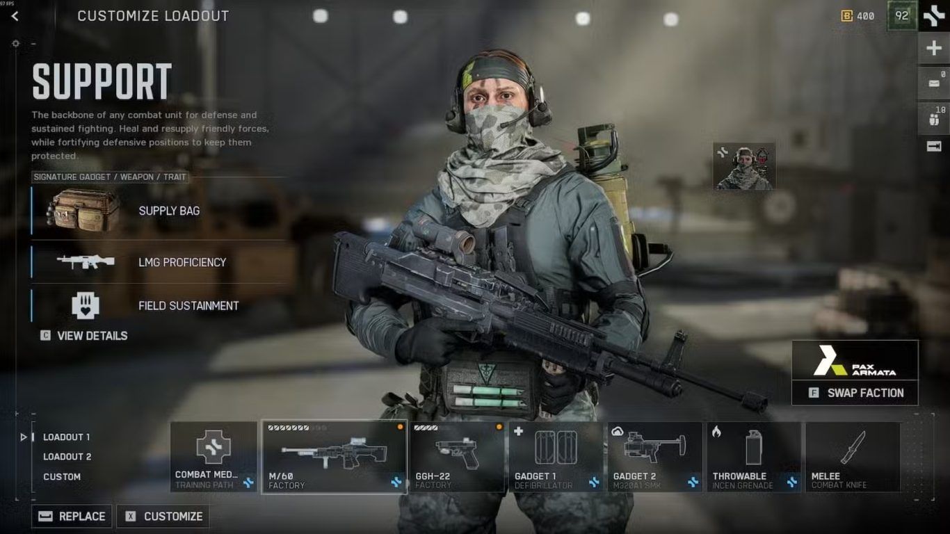 | الدعم (Support) | أجهزة الإنعاش (Defibrillators) • قاذف دخان M320 / حاجز قابل للنشر (Deployable Cover) • قنابل حارقة أو دخانية (Incendiary/Smoke Grenades) |