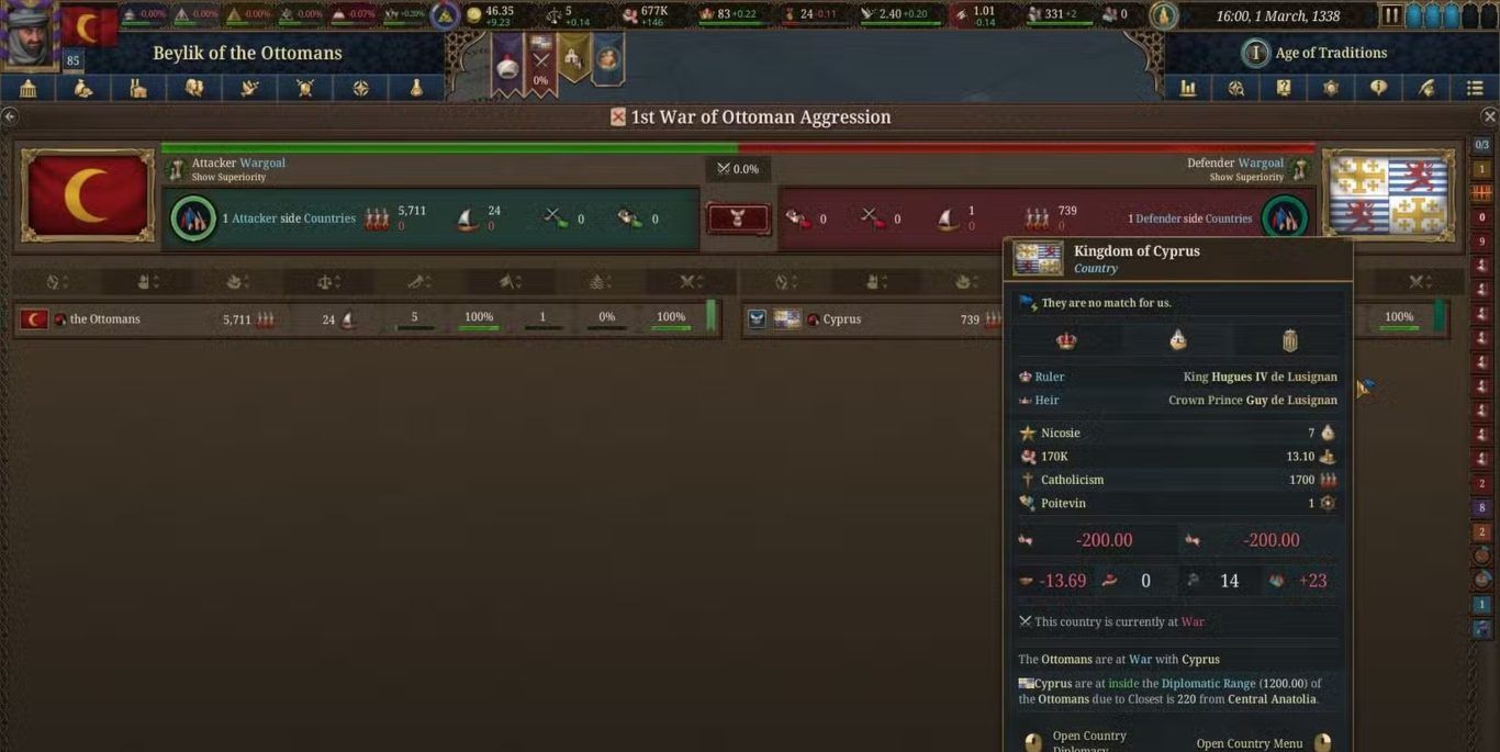 في حال لم تكن في حالة حرب بعد، يمكنك إعلان الحرب بنفسك، لكن تأكد من امتلاكك مبرر حرب (Casus Belli) رسمي لتجنب العقوبات الدبلوماسية، حتى وإن اضطررت لتزويره عبر التجسس.