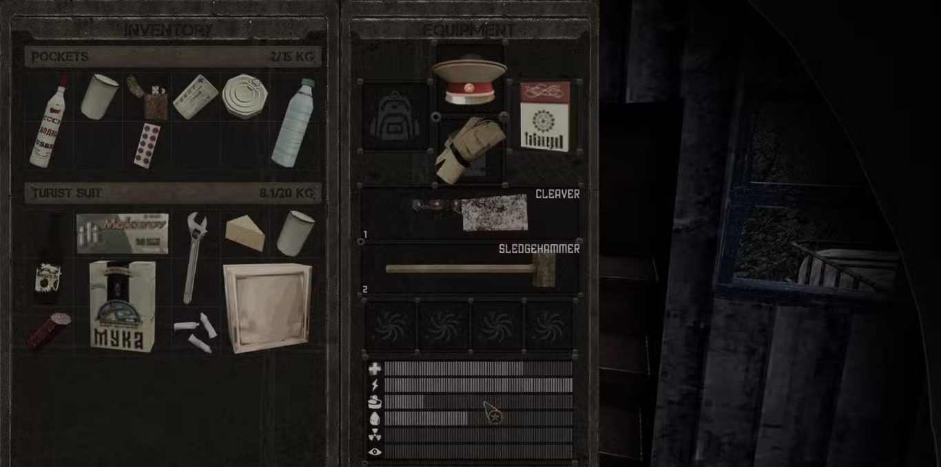هذه المؤشرات الأربعة هي الأكثر أهمية في اللعبة، ويجب مراقبتها باستمرار، لأنها تمثل الخط الفاصل بين الحياة والموت في عالم Misery القاسي. لكن ما قد لا تلاحظه في البداية هو أن هناك مؤشرين إضافيين لا يظهران على الشاشة طوال الوقت، وهما Hunger (الجوع) وThirst (العطش). يمكنك رؤيتهما فقط عند فتح حقيبتك (Inventory)، ولهذا السبب ينسى الكثير من اللاعبين متابعتهما حتى يفوت الأوان.