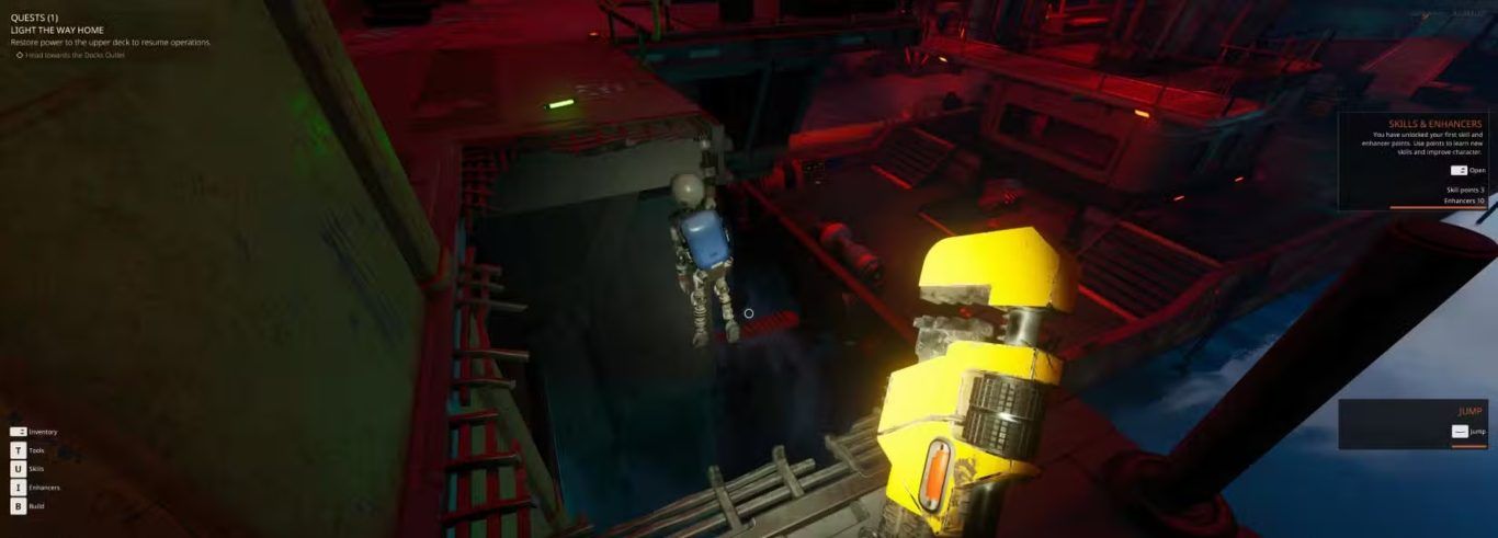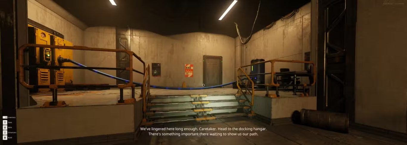 تبدأ مغامرتك في قبو مظلم وضيق حيث تقدم لك اللعبة إرشادات أولية للتنقل داخل مبنى ضخم أثناء إعادة تشغيل أنظمته الكهربائية والميكانيكية خطوة بخطوة. في البداية، تطلب منك المهمة الرئيسية جعل المبنى يعمل من جديد ثم تحديد موقع سفينتك استعدادًا للانطلاق في رحلتك الأولى. ومع ذلك، إذا اكتفيت بتنفيذ هذه التعليمات الأساسية فقط دون استكشاف المنطقة المحيطة جيدًا، فستفوت على نفسك كمية هائلة من الموارد القيّمة التي ستساعدك كثيرًا في المراحل اللاحقة من اللعبة.