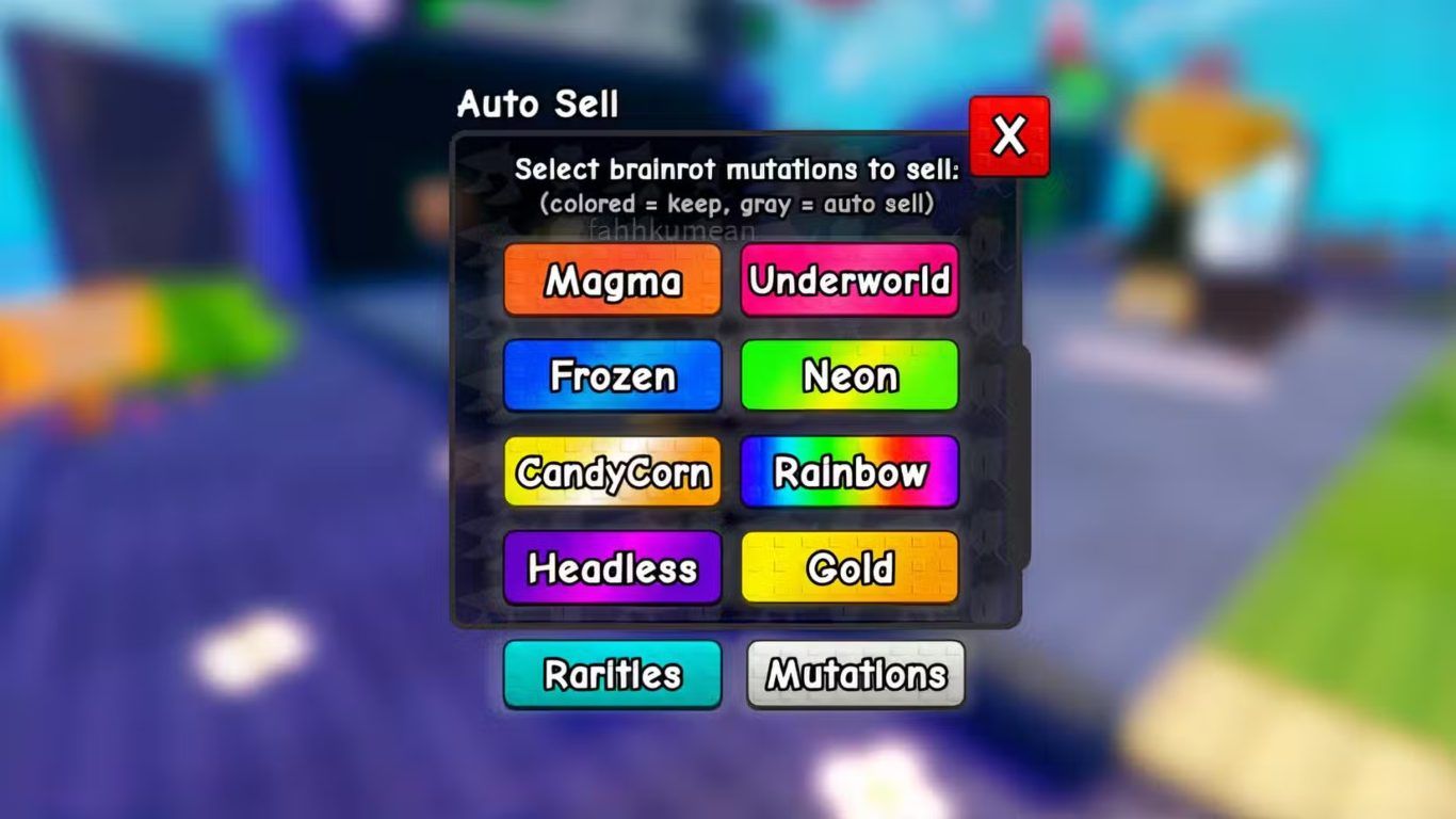 يظهر زر Auto Sell في واجهة الجرد على شكل أيقونة رمادية تقع على الجانب الأيمن من القائمة عند الضغط عليها تُفتح نافذتان أساسيتان هما Rarities وMutations في قسم Rarities ستجد جميع درجات الندرة الخاصة بمخلوقات Brainrots التي يمكنك جمعها مثل العادية والنادرة والأسطورية أما قسم Mutations فيعرض لك أنواع الطفرات المختلفة التي يمكن أن تمتلكها هذه الكائنات مثل زيادة القوة أو السرعة أو المتانة.