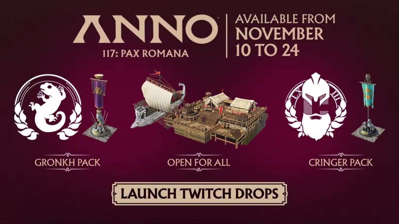 أعلنت شركة Ubisoft عن حدث خاص بمناسبة إطلاق لعبة Anno 117: Pax Romana يتيح للاعبين فرصة الحصول على مكافآت مجانية داخل اللعبة من خلال متابعة البثوث المباشرة على منصة Twitch. يمتد هذا الحدث من 10 نوفمبر حتى 14 نوفمبر، وخلال هذه الفترة يمكن لأي لاعب مشاهدة البثوث الرسمية أو بثوث بعض صنّاع المحتوى المعتمدين للحصول على عناصر حصرية تُفعّل تلقائياً عند إصدار اللعبة أو عند شرائها لاحقاً في أي وقت.