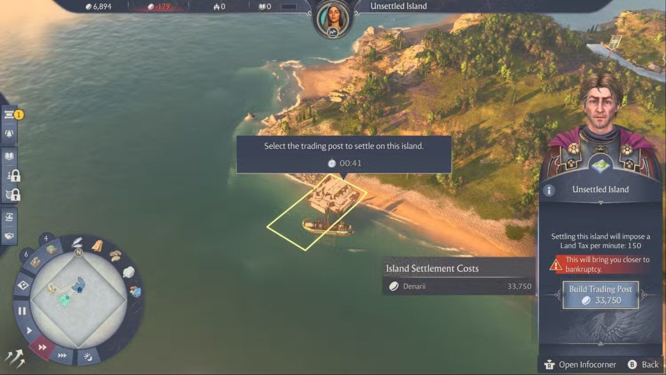 كلما كانت الجزيرة أكبر ارتفعت الضريبة التي يدفعها اللاعب في كل دقيقة وازدادت التكلفة المطلوبة لبناء مركز تجاري جديد على أرضها وعندما يقرر اللاعب إنشاء مدينة جديدة فعليه الضغط على زر Build Trading Post لتأكيد البناء ثم تبدأ عملية الاستيطان التي تمنحه موطئ قدم إضافيًا داخل الإمبراطورية مما يوسع شبكة الموارد ويربط المدن ببعضها عبر خطوط تجارية منظمة.