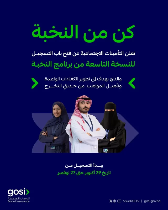 أعلنت المؤسسة العامة للـتأمينات الاجتماعية عن فتح باب التسجيل في النسخة التاسعة من برنامجها المنتهي بالتوظيف “النخبة”، لتأهيل المواهب وتطوير الكفاءات الواعدة من الشباب حديثي التخرج، من خلال عدة برامج وأساليب تدريبية مكثفة.