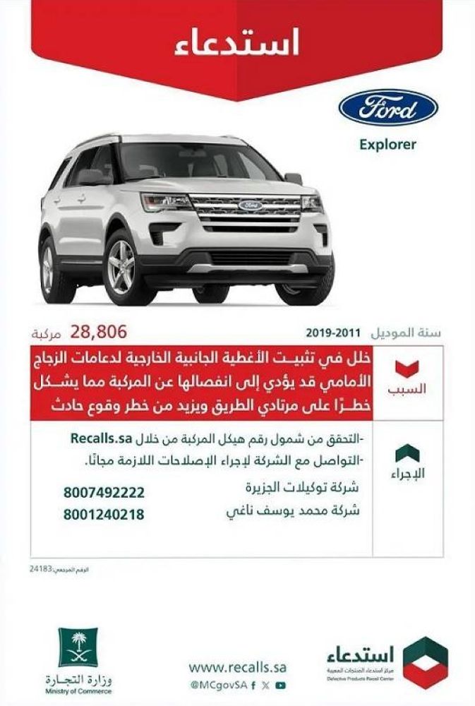 أعلنت وزارة التجارة استدعاء 28806 مركبات فورد «Explorer» موديل 2011 - 2019، لوجود خلل في تثبيت الأغطية الجانبية الخارجية لدعامات الزجاج الأمامي، قد يؤدي إلى انفصالها عن المركبة مما يشكل خطرًا على مرتادي الطريق ويزيد من خطر وقوع حادث. وتدعو الوزارة مستخدمي المركبات المشمولة بالاستدعاء إلى التواصل مع الوكيلين المحليين شركة توكيلات الجزيرة على الرقم المجاني (8007492222)، وشركة محمد يوسف ناغي على الرقم المجاني (8001240218) لإجراء الإصلاحات اللازمة مجانًا. ويمكن التحقق من شمول رقم هيكل المركبة بحملة الاستدعاء من خلال موقع مركز استدعاء المنتجات المعيبة (Recalls.sa).