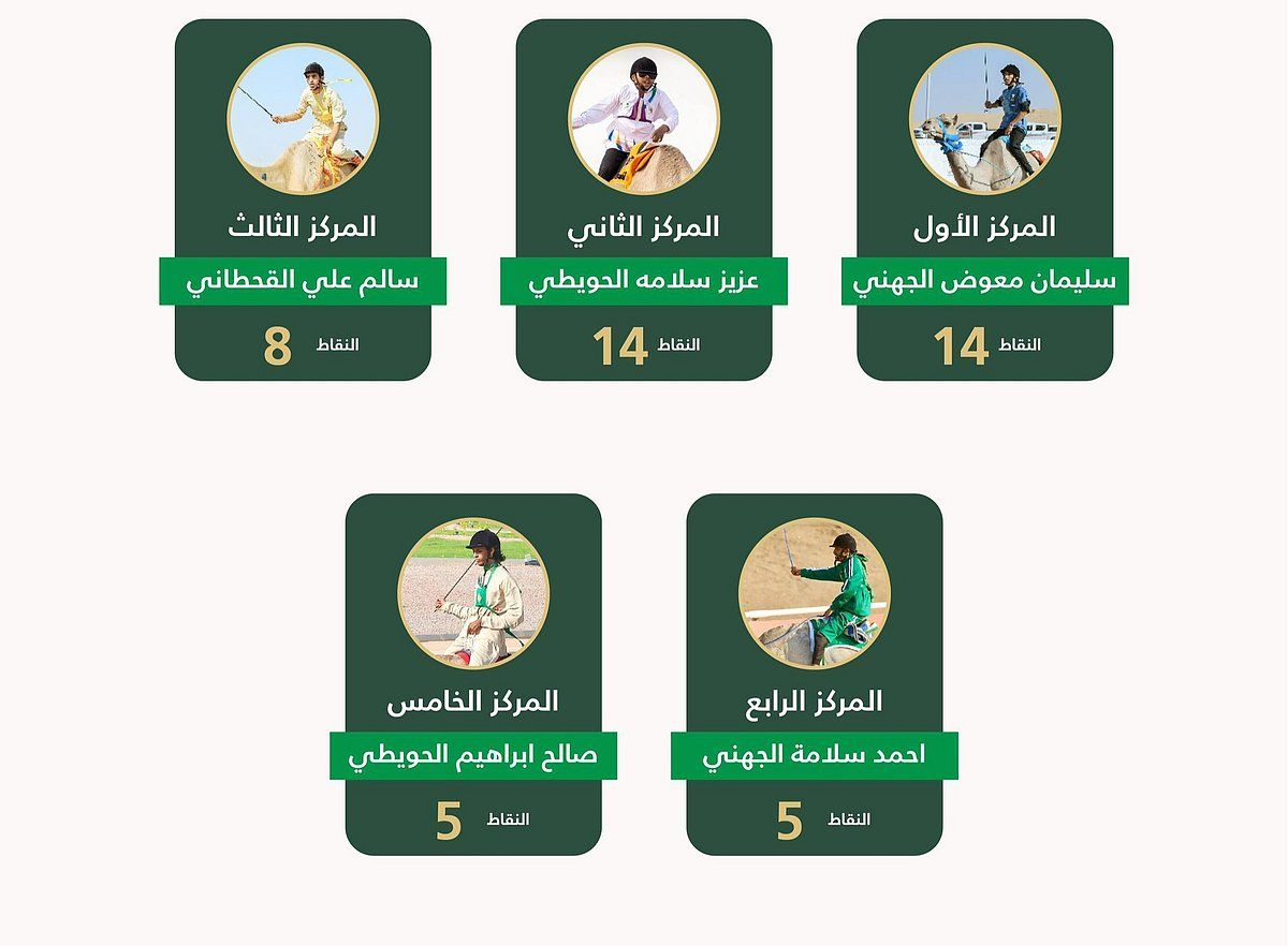 وتوج نائب رئيس الاتحاد السعودي للهجن محمد البلوي، أبطال المراكز الثلاثة الأوائل في الأشواط الـ 7، وحقق الهجان سليمان الجهني برفقة المطية "الجوكر" لقب الشوط الأول وكأس مهرجان خادم الحرمين الشريفين (زمول وثنايا قعدان) بتوقيت بلغ 8:53.448 دقائق، والهجان عزيز الحويطي، برفقة المطية "بشاير" لقب الشوط الثاني وكأس مهرجان خادم الحرمين الشريفين (حيل وثنايا بكار) بتوقيت بلغ 9:00.141 دقائق، والهجان الإماراتي سعيد المهيري، برفقة المطية "بحار" لقب الشوط الثالث وكأس مهرجان خادم الحرمين الشريفين (زمول وثنايا قعدان) بتوقيت بلغ 9:07.853 دقائق، والهجان فيصل المسعودي، برفقة المطية "الجليله" لقب الشوط الرابع وكأس مهرجان خادم الحرمين الشريفين (حيل وثنايا بكار) بتوقيت بلغ 9:13.190 دقائق، والهجان عادل الهرفي، برفقة المطية "مبلش" لقب الشوط الخامس وكأس مهرجان خادم الحرمين الشريفين (زمول وثنايا قعدان) بتوقيت بلغ 9:12.321 دقائق.