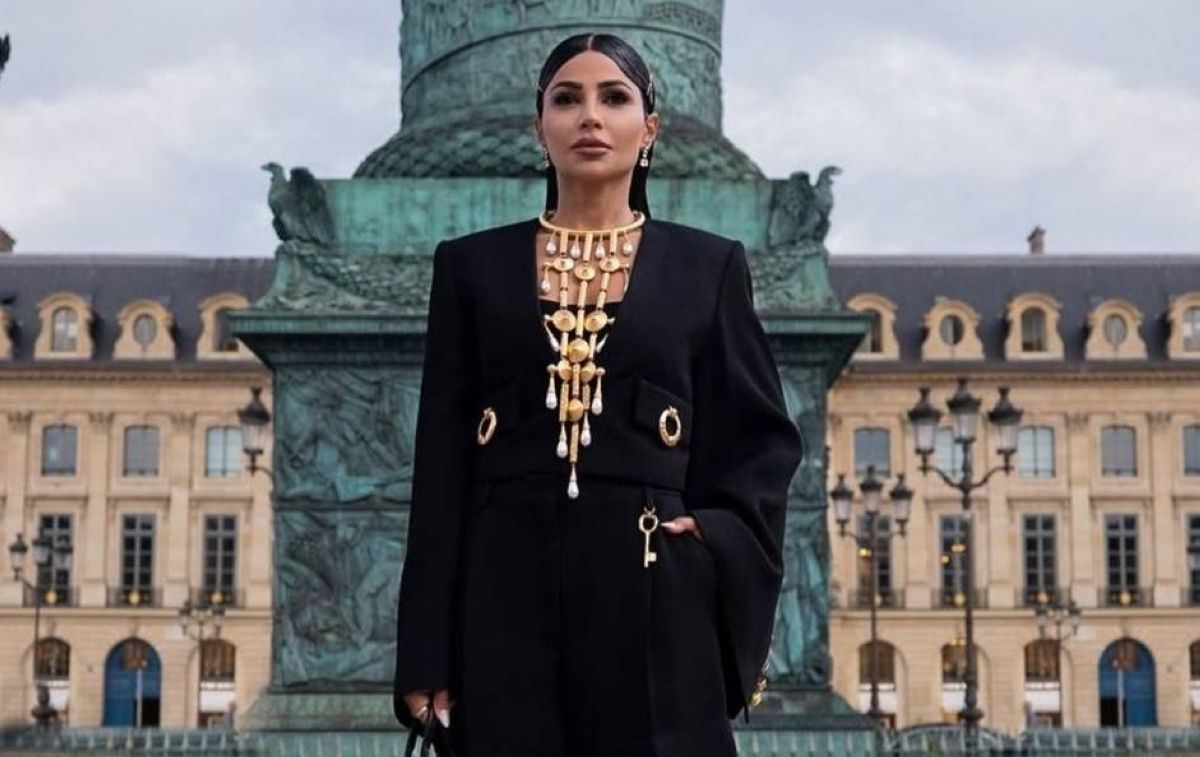 اختارت فستاناً أسود قصيراً بتصميم حاد وأكتاف بارزة منحت قوامها حضوراً قوياً، فيما أضافت التفاصيل الذهبية في منطقة الصدر طابعاً نحتياً يذكّر بالمجوهرات الفاخرة ويعزّز من قيمة الإطلالة.