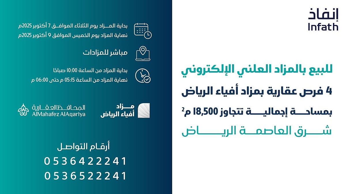 تعلن شركة المحافظ العقارية وبإشراف مركز الإسناد والتصفية «إنفاذ» بقرار من محكمة التنفيذ، وبحكم من محكمة الأحوال الشخصية، عن إقامة مزاد "أفياء " الإلكتروني على منصة مباشر للمزادات حيث يبدأ المزاد يوم الثلاثاء 07 أكتوبر الساعة 10 صباحاً وينتهي يوم الخميس 09 أكتوبر الساعة 6 مساءً وبحسب الموعد المحدد لكل عقار.