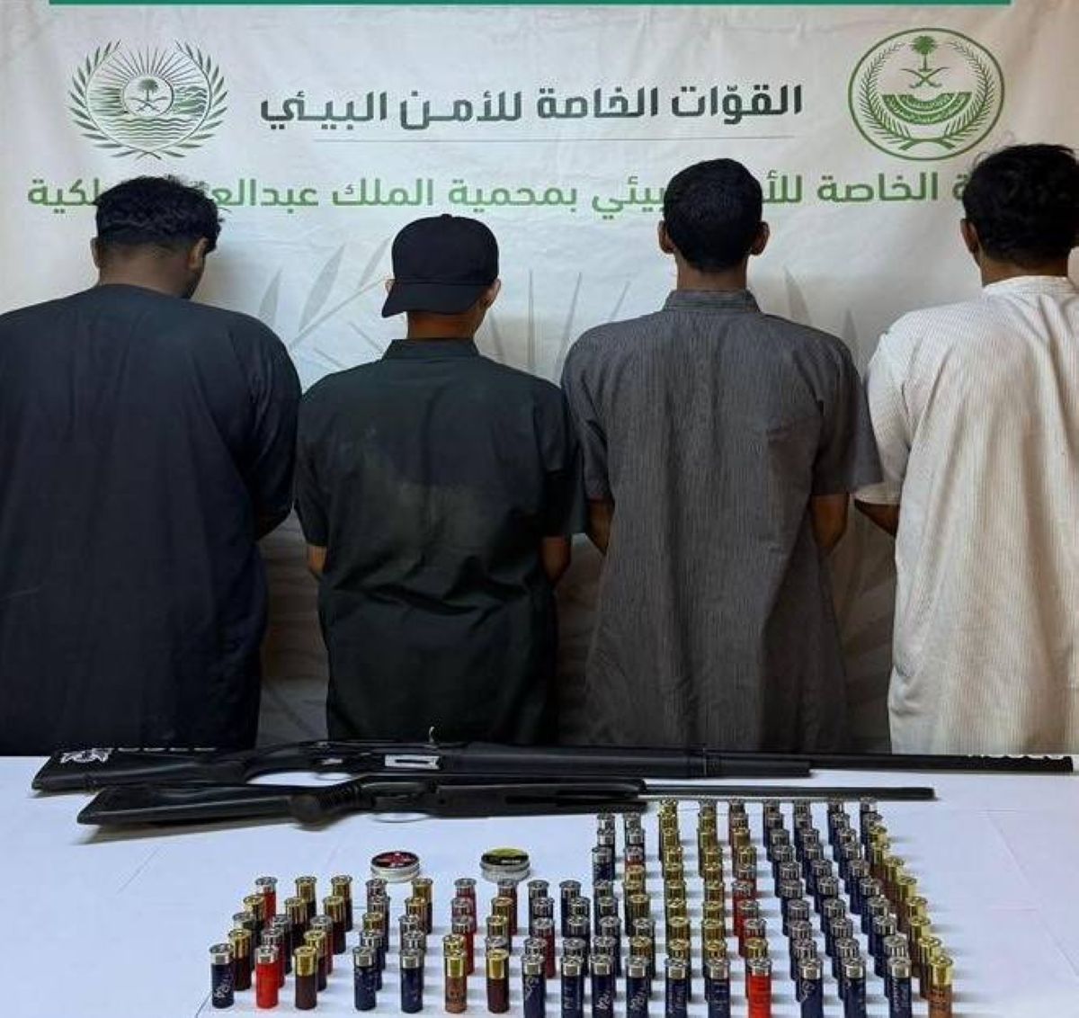 تمكنت القوات الخاصة للأمن البيئي وهي تؤدي مهماتها في تنفيذ نظام من ضبط (4) مواطنين مخالفين لنظام البيئة، لارتكابهم مخالفة الشروع في الصيد دون ترخيص في محمية الملك عبدالعزيز الملكية، بحوزتهم بندقية شوزن وبندقية هوائية و(632) ذخيرة منوعة، وتم الإجراءات النظامية بحقهم.