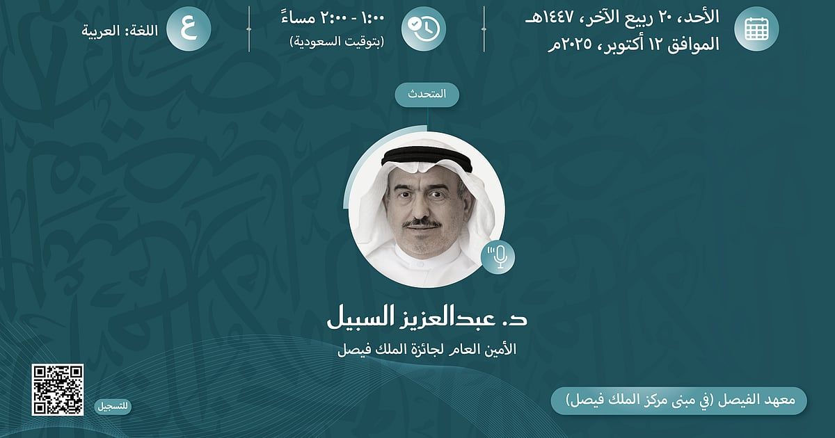 في إطار برامجه الثقافية، يُنظِّم مركز الملك فيصل للبحوث والدراسات الإسلامية بالتعاون مع جائزة الملك فيصل، يوم الأحد 12 أكتوبر 2025م، محاضرة حضورية بعنوان «جائزة الملك فيصل: سيرة لم تُرْوَ»، يقدمها الأمين العام للجائزة الدكتور عبدالعزيز السبيل، وذلك في معهد الفيصل بمقر المركز في الرياض، عند الساعة الواحدة ظهرًا.