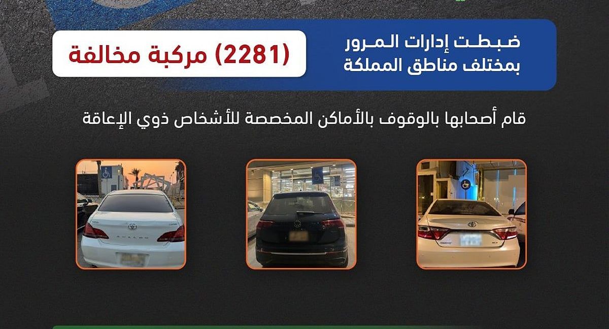 وأسفرت الحملة عن ضبط 2281 مركبة مخالفة، قام أصحابها بالوقوف في أماكن مخصصة لذوي الإعاقة، في مخالفة صريحة للأنظمة واللوائح المرورية.
