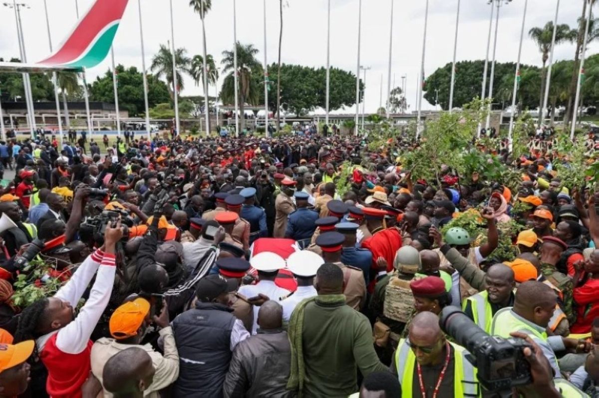 وفي مشهد موازٍ، اجتاح عدد من المشيعين مطار نيروبي الدولي قبل وصول الجثمان من الهند، ما تسبب بتعطيل مراسم الاستقبال الرسمية وتوقفت حركة المطار لنحو ساعتين.