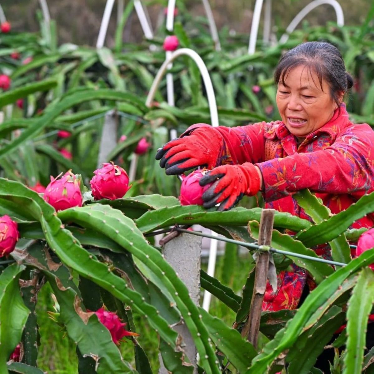 تشهد أشجار البيتايا في قرية دياوشينغ التابعة لمقاطعة سيتشوان الصينية حصاداً وافراً. وينشغل مزارعو الفاكهة بقطفها ونقلها وتزويد السوق بها. وفي الصورة مزارعة أثناء قطف ثمار البيتايا. (إيكونومي دايلي الصينية)