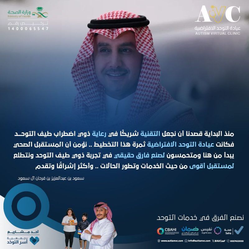 من جانبه ذكر سمو رئيس مجلس إدارة جمعية أسر التوحد الأمير سعود بن عبدالعزيز بن فرحان آل سعود :” اليوم نشهد تحقيق أحد أهم مشاريع الجمعية المواكب لرؤية بلادنا الغالية 2030 والذي عملنا على تحقيقه بالتزام وانتظام لسد ثغرات واحتياجات ذوي التوحد الذين لا يستطيعون الوصول للخدمات بكل يُسر وسهولة”.