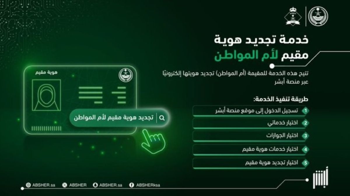 كشفت منصة «أبشر» عن إتاحة خدمة إلكترونية لتمكين أم المواطن المقيمة من تجديد «هوية مقيم» بكل يسر وسهولة عبر المنصة، دون الحاجة إلى مراجعة الجهات المختصة.