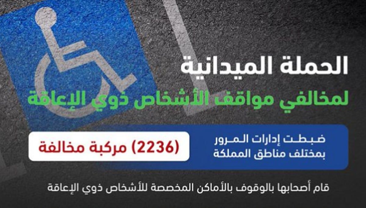أعلنت الإدارة العامة للمرور ضبط 2236 مركبة مخالفة متوقفة في الأماكن المخصصة للأشخاص ذوي الإعاقة، وذلك في جميع مناطق المملكة.
