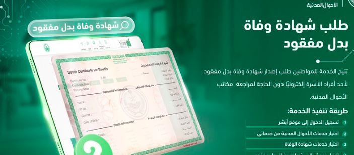 وقالت منصة أبشر، في إنفوجراف توضيحي نشرته عبر حسابها الرسمي على منصة “إكس”: “تتيح خدمة طلب شهادة وفاة بدل مفقود للمواطنين طلب إصدار شهادة وفاة بدل مفقود لأحد أفراد الأسرة إلكترونيا دون الحاجة لمراجعة مكاتب الأحوال المدنية”.