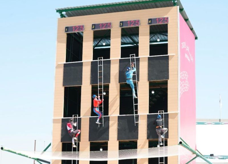 وشهدت منافسات اليوم الأول للبطولة خلال الفترة الصباحية إقامة الأدوار التمهيدية لسباق التسلق باستخدام سلم الخطاف إلى الطابق الرابع من برج التدريب للرجال، وأقيمت الأدوار التمهيدية في سباق تسلق البرج بالسلالم والصعود إلى الطابق الثاني من برج التدريب للسيدات، تلتها منافسات نصف النهائي، لسباق التسلق باستخدام سلم الخطاف إلى الطابق الرابع من برج التدريب للرجال.