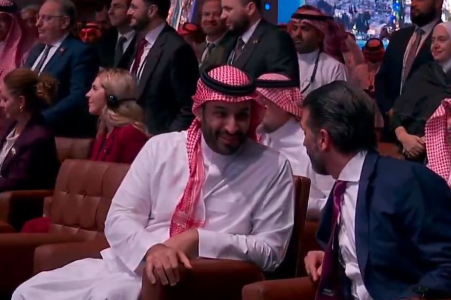 تبادل صاحب السمو الملكي الأمير محمد بن سلمان ولي العهد رئيس مجلس الوزراء، الحديث الجانب مع ترمب الابن في مبادرة مستقبل الاستثمار.