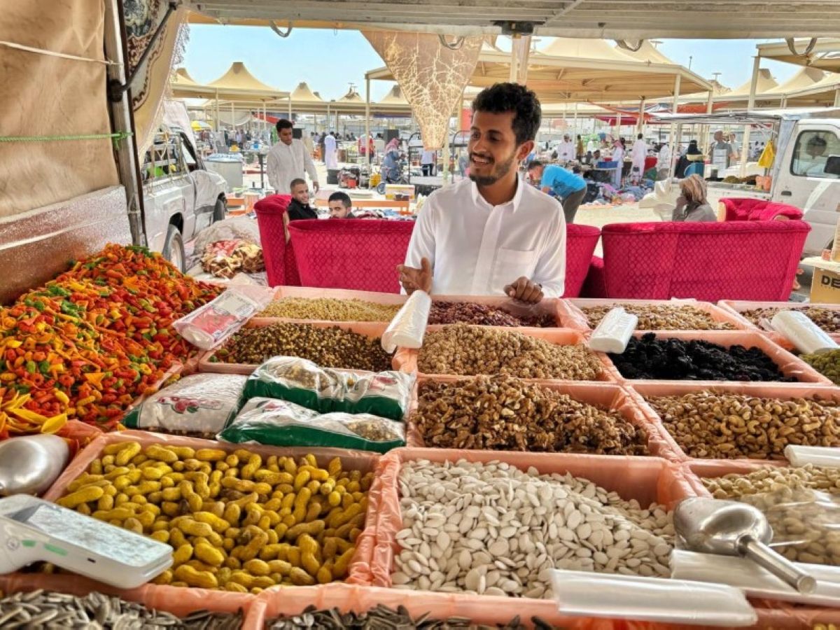 البائع سالم الحويطي يعرض المكسرات التي تشهد إقبالا كبيرا من الأهالي والمقيمين في سوق السبت بتبوك. (تصوير: علي بدير)