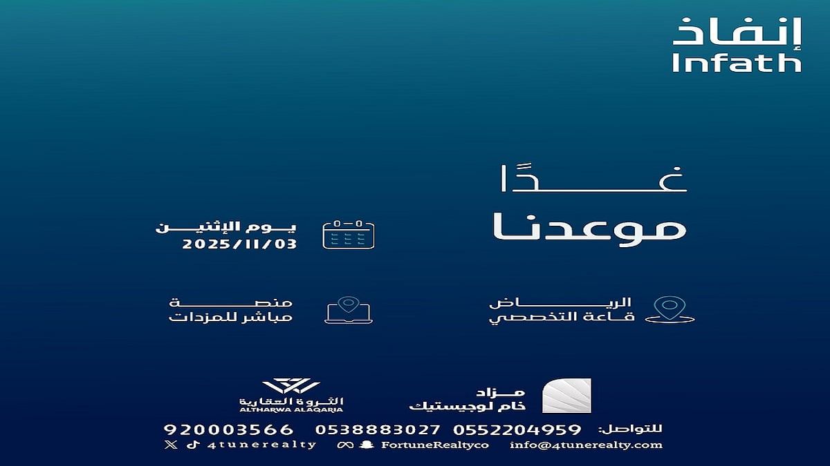 تعلن شركة الثروة العقارية وبإشراف مركز الإسناد والتصفية «إنفاذ» وبقرار من محكمة التنفيذ عن انطلاق مزاد "خام لوجيستيك" غدًا الإثنين 2025-11-3، والذي سيُقام حضورياً في قاعة التخصصي، وإلكترونيًا عبر منصة مباشر للمزادات.